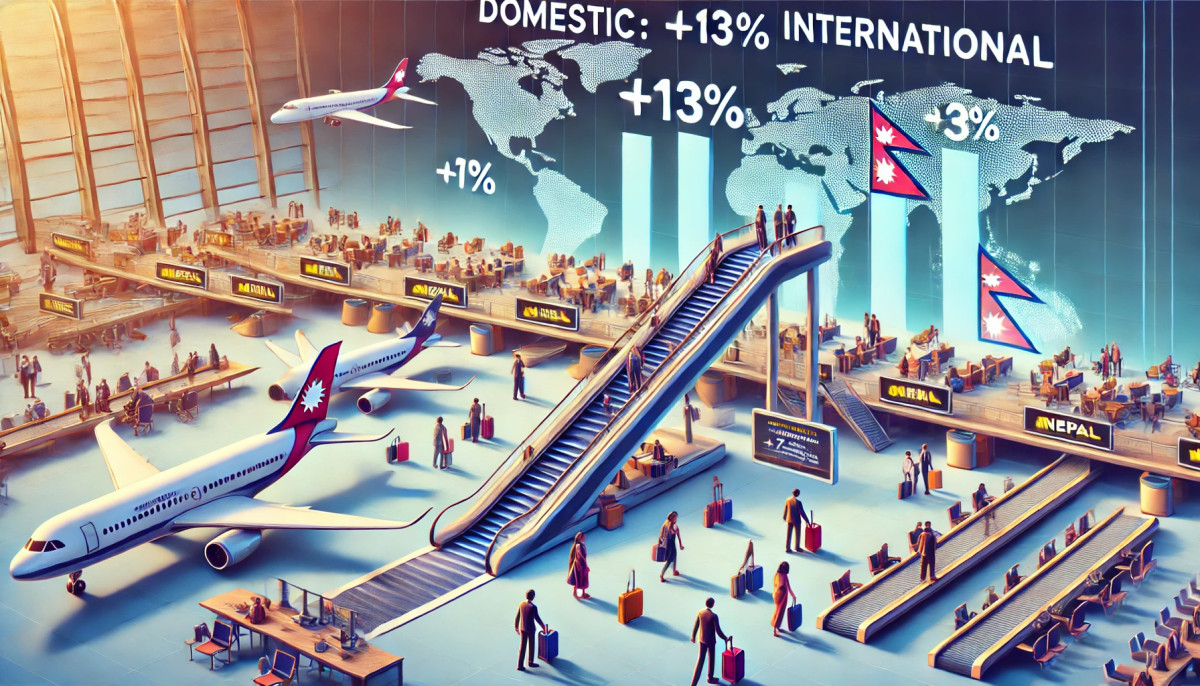 Kathmandu,Nepal: Air passenger traffic in Nepal has witnessed a remarkable surge, with both domestic and international sectors showing significant growth. According to the Civil Aviation Authority of Nepal (CAAN), domestic air travelers increased by 13% and international passengers by 7.9% in 2024 compared to the previous year.