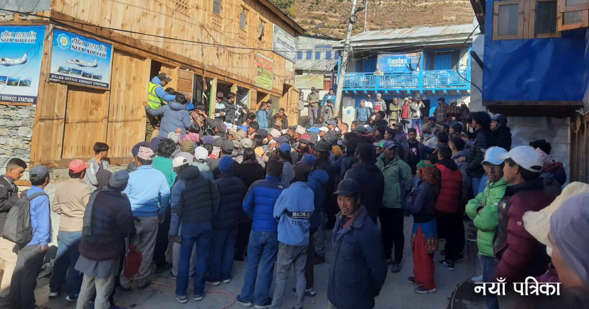 Due to the distribution of tickets depending on access to Simkot Airport, the general public is forced to wait at the gate every day.
